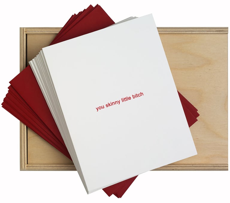 4.25 x 5.5 - heavy white stock - raised type and letterpress - 10 signature red envelopes